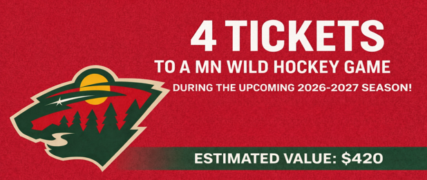 Score big with four premium MN Wild tickets for the 2026-27 season! Perfect for bringing family or friends to cheer on our hometown heroes at Xcel Energy Center — pure hockey excitement awaits. Contact will be provided to the winning bidder. VALUE: $420