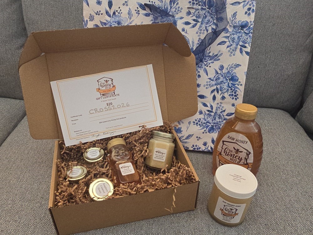Treat yourself or someone special to this delicious honey lover’s collection from Honey Hut! This sweet package includes a $20 gift certificate plus an incredible assortment of premium honey products to enjoy at home. Included is a generous 2 lb jar of raw honey, a rich and smooth 12 oz jar of raw creamed honey, and smaller flavored varieties including Lemon, Raspberry, and Irish Cream creamed honey for a fun and flavorful tasting experience. Also included is an adorable small bear filled with classic raw honey. Perfect for tea lovers, bakers, foodies, or anyone who enjoys natural sweetness, this bundle is ideal for drizzling, spreading, gifting, or simply savoring by the spoonful. A delightful mix of wholesome goodness and irresistible flavor! Value $120.00